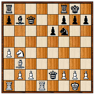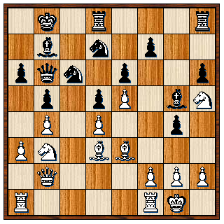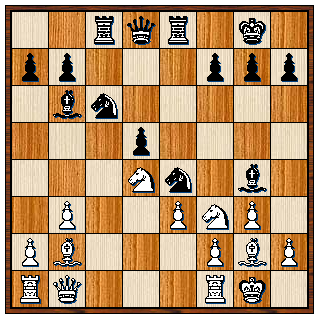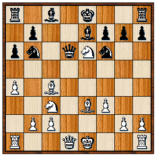 12…De5?? 13. Dd4 Pxc4 14. Dxe5 Lxe6 15. Dg5? Pd5 16. Dxg7 Lf6 17. Dh6 Lxc3+ 18. bxc3 Pdxe3 19. Kf2 O-O-O 20. The1 Td2+ 21. Te2 Txe2+ 22. Kxe2 Td8