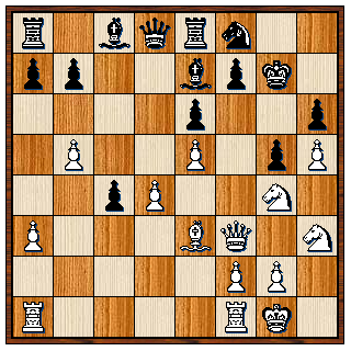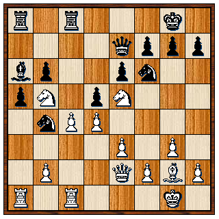 Wat structuur betreft lijkt het wat op mijn stelling, alleen heeft zwart wat meer ruimte dan ik. Wit heeft zojuist 19. Pb3 gespeeld. Rienk met zwart kan het niet laten om een tactische verwikkeling aan te gaan, want waarom kom je anders schaken op een koude zaterdagmiddag. Toch pakt het niet goed uit.