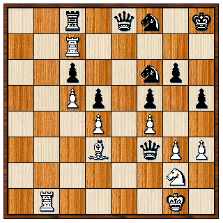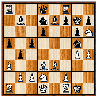 1. d4 d6 2. Pc3 Pf6 3. e4 Pbd7 4. Pf3 e5 5. Lc4 LP7 6. Pg5 O-O 7. Pf3 c6 8. Le3 b5 9. Ld3 a5 10. a3 Lb7 11. O-O b4 12. Pe2 exd4 13. Pexd4 c5 14. Pf5 g6 15. Ph6+ Kg7 16. g4 Pxe4 17. Pd2 Pg5 18. h4