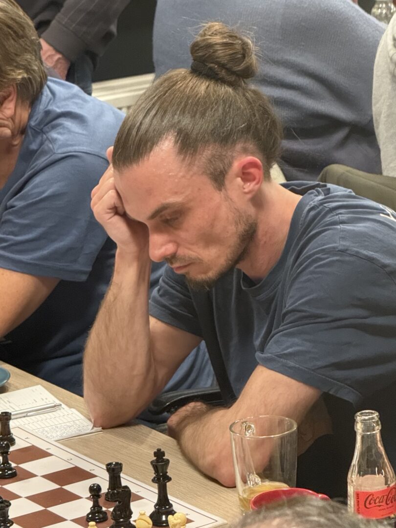 Het ziet er een beetje eng uit, maar Marc laat zich niet afbluffen, pakt het paard en dan gaat de witte stelling in rook op en wordt de koning onder vuur genomen.
