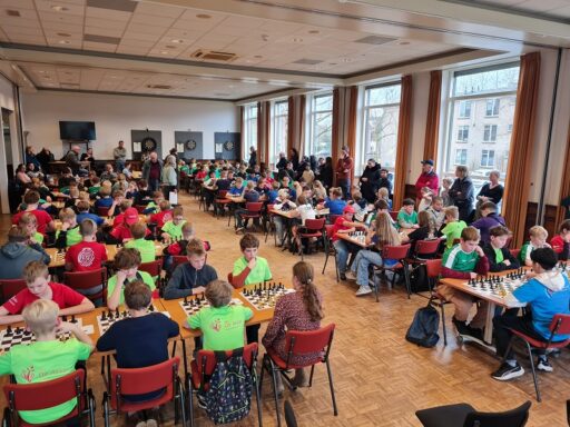 In de archieven van MSV las ik dat men in 1981 is begonnen met het Meppeler Basisschool Schaak Kampioenschap. M.u.v. corona periode is het denk ik een jaarlijks terugkerend evenement. Vorig jaar hadden we zoveel deelnemers dat we ze over 2 zalen moesten verdelen. Dat wilden we dit jaar niet weer dus werd het maximum aantal deelnemers op 120 bepaald. Scholen mochten maximaal 15 kinderen aanmelden: waren er dan teveel kinderen dan zouden de eerste 14 of 13 mee kunnen doen, waren er plekken over dan werden die eerlijk verdeeld over de scholen die al het maximum aantal kinderen hadden opgegeven.