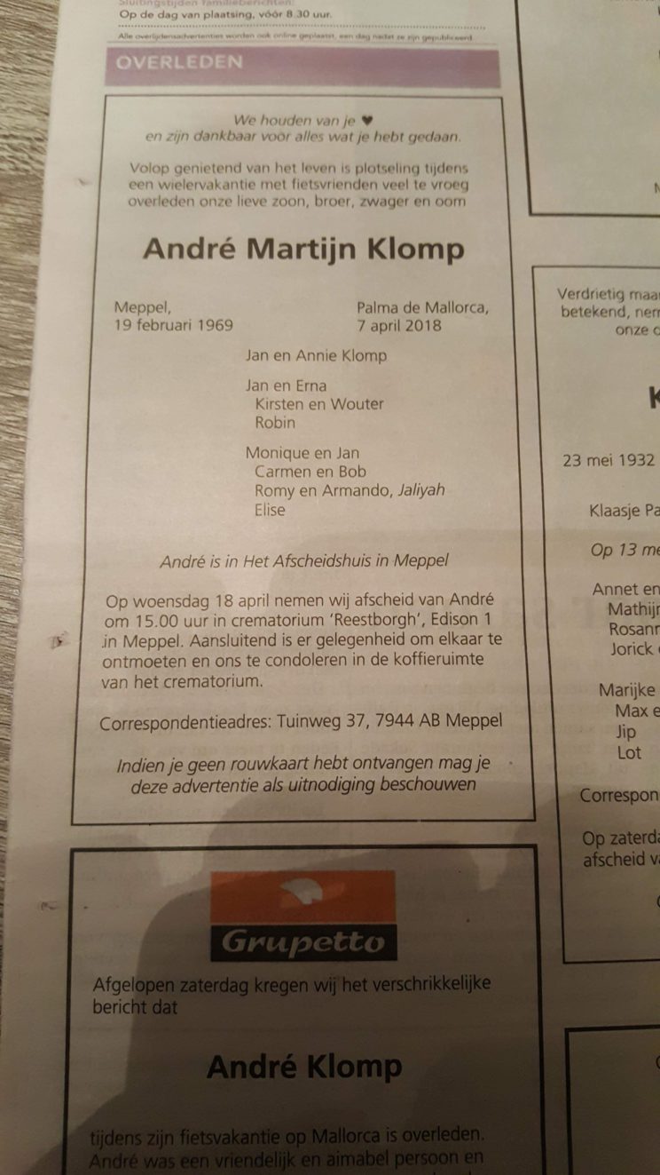 Overlijdensadvertentie AndréDoor Sibbele Bonthuis / 13 april 2018 Komende woensdag is de afscheidsdienst van André om.15.00 uur in het crematorium te Meppel. De schakers van de MSV zijn nadrukkelijk welkom om dit afscheid bij te wonen.