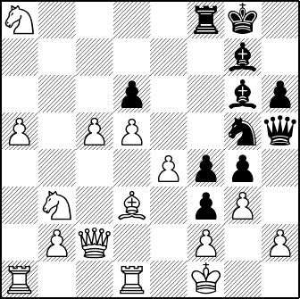 Wit staat nu een toren, een stuk en twee pionnen voor. Maar de overgebleven zwarte stukken werken wel prachtig samen in hun aanval op de witte koning. De witte stukken staan verspreid over het hele bord zonder veel samenhang, en de witte koning voelt zich niet veilig. Hoe gaat zwart verder?