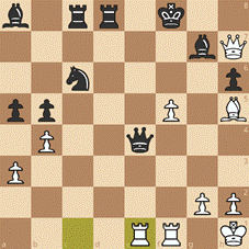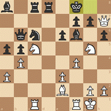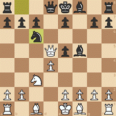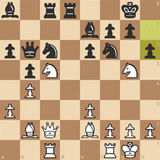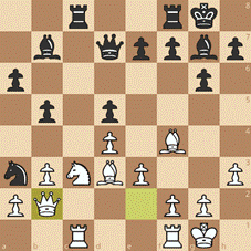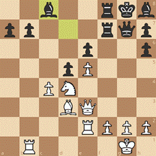 Meteen het bord in brand, leuk! Wit greep hier mis met 9.Db5 a6 10.Dxb7 Pxd4 11.e4 en nu had Marrit met 11…Lc8!! (Dxa8 Lg4+) op zet 11 al een nieuw diagram kunnen verdienen, maar ze speelde 11…Pc2+ 12.Ke2 Lg4+ 13.f3 Pxa1 14.fxg4 e6 en wit staat natuurlijk wel gewoon een kwal achter. Hier nog een stukje fijnzinnige techniek: