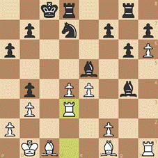 Weer een belangrijk moment in de partij. De winnend(st)e voortzetting is 21.Lh5, na hxg5 22.fxg5 hou je het simpelweg niet dicht en Pxb4, in veel varianten de reddende zet werkt niet vanwege Pd7+ Txd7 Txc8. Een ander loeisterk idee is 21.Pge4 gevolgd door f5, maar Roel ging voor iets anders dat bijna werkt. Helaas, er zat een rekenfout in, dat komt aan het licht na de 25ste zet.