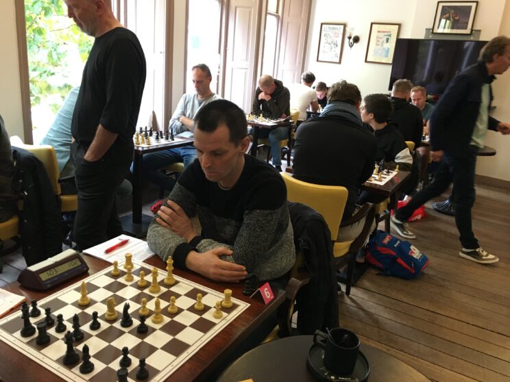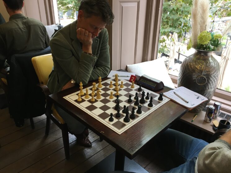 Hartstikke fijn dat we Andries weer achter het bord hebben weten te krijgen. Goede gezondheid is niet vanzelfsprekend in het leven, en we hopen dat hij het spoedig weer terugkrijgt. Het schaken gaat ondertussen prima, zo blijkt. Als een jonge hond een pion offeren en ten aanval. Werkte de tuinstoel als doping? Bij ZSG hebben we wel een traditie dat het de schuld is van het te felle licht, wiebelende stoelen, te weinig beenruimte of het shirt van de tegenstander met een grappige tekst als er verloren wordt. Dus het effect is zeker niet te onderschatten.