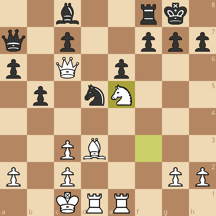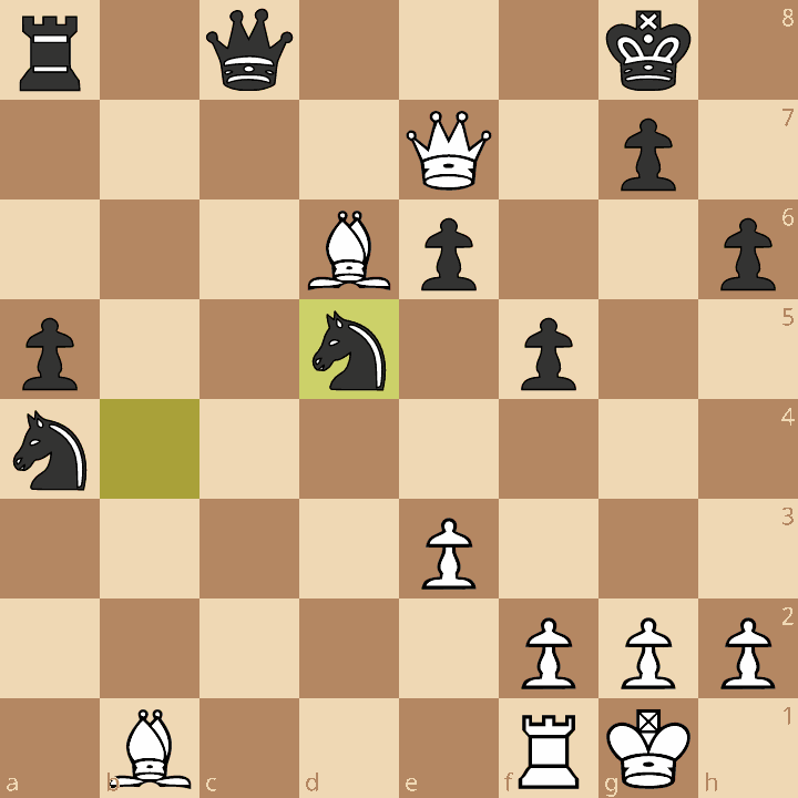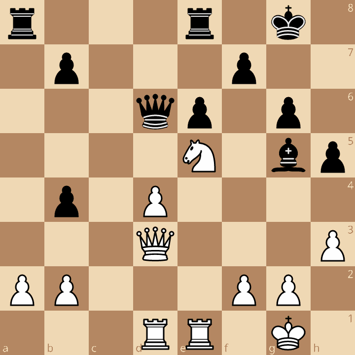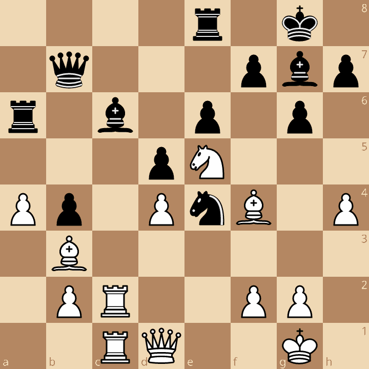 Na al verschillende keren goed weggekomen te zijn kreeg ik ineens voordeel in de schoot geworpen: 1. Pb5 kennelijk had hij bedacht dat ik die loper niet kon missen maar een pion is een pion: 1…f5 2. De2 Lxb5 3. axb5 Dxb5 en nu blijkt e2 ook niet echt een handig veld wegens de penning, dus maar terug: 4. Dh5. Ik ben vergeten welk spook ik hier zag, maar ik vond het nodig om die dame even weg te jagen met 4…De8. Er is niks mis met …Pxb3.