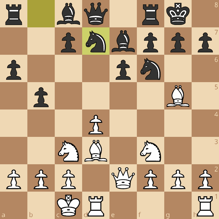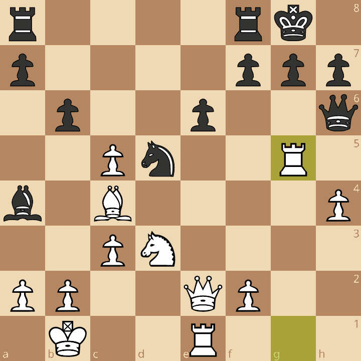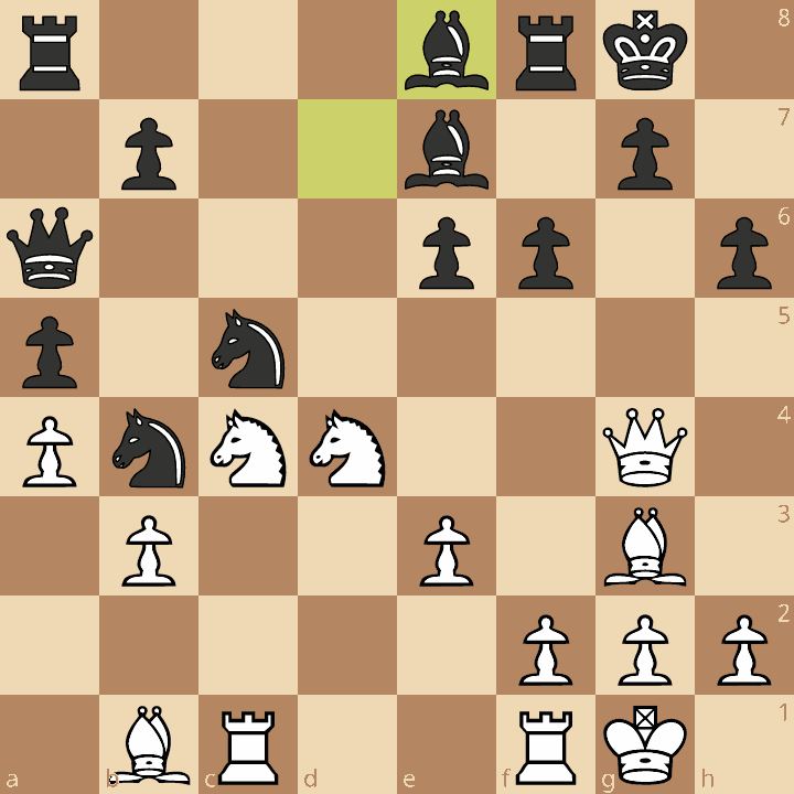 Even later. Alwin heeft zojuist, jawel, een blunder begaan met Pe5. De engine is genadeloos. Pg5! was prachtig geweest, dan hou je je dame op het bord via de noodgreep Lxh7&Pxf7+ maar in de partij gebeurde iets dergelijks toen de tegenstander terugblunderde met 1…Td8?? Ik oordeel niet hoor, al deze blunders zien er logisch uit en werken bijna, bovendien heb ik zelf méér dan genoeg slechte zetten gedaan. Maar goed, de weg naar remise was 1…Lb7.