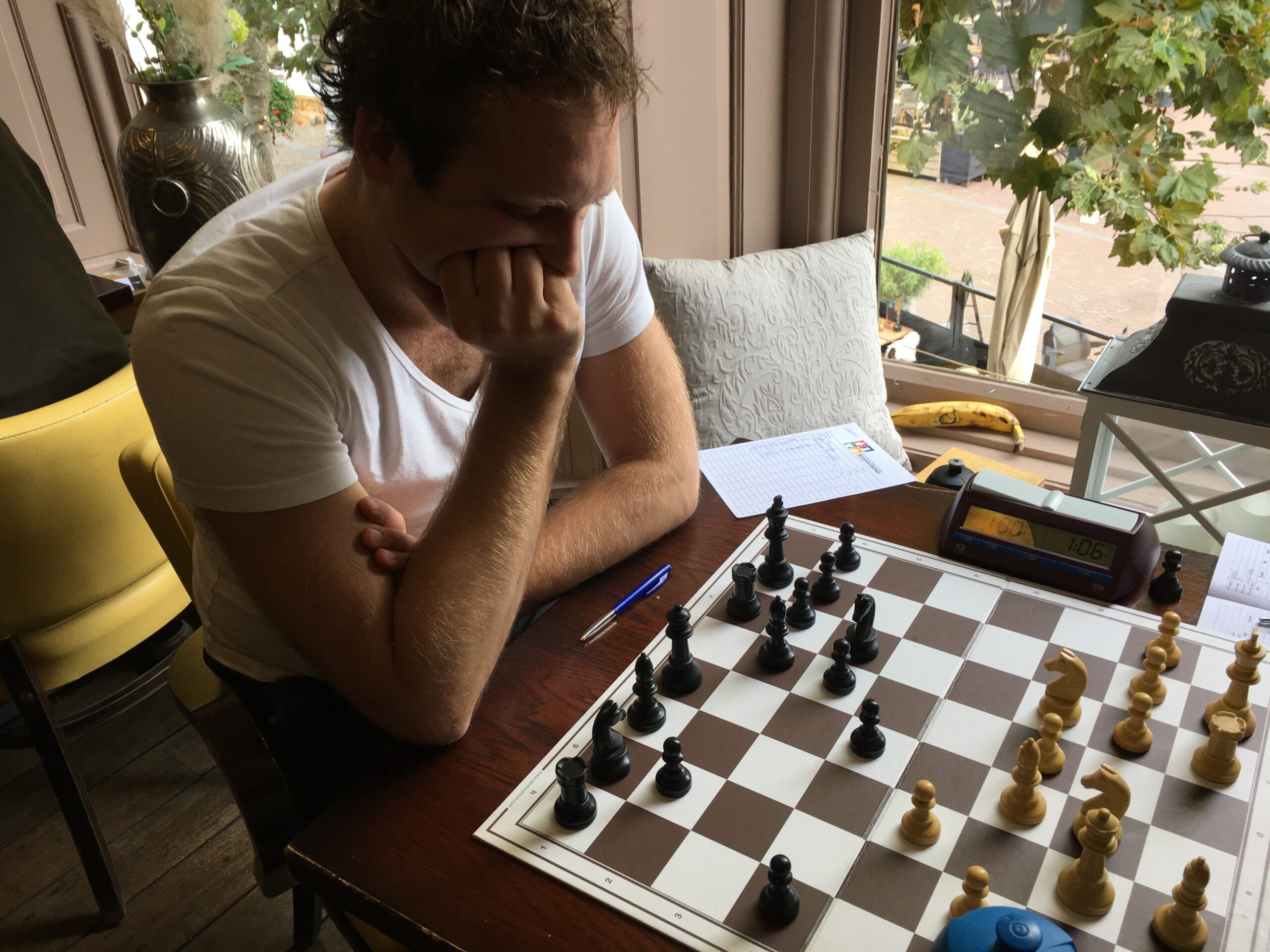 Zelf was ik met een totaal andere energie gearriveerd dan de gasten. Nog niet helemaal hersteld van de SOS-partij namens ZSG op maandag tegen Apeldoorn (teleurstellende remise), slecht geslapen en ook nog met haast. De parkeermeter waar ik als een bezetene op aan het rammen was om de parkeertijd naar 18:00 uur te drukken bleek niet mee te werken: maximale parkeertijd 2 uur. Snel reed ik door naar de Kromme Elleboog en beende met een banaan, pen, trui en kussens voor de tuinstoel voor Andries naar Oasis. Hopend op een zwakkere tegenstander, die ik niet had, had ik ’s morgens nog wat Spaanse hoofdlijnen bekeken, die ik niet op het bord kreeg: 1.d4, hoera. De vele bananenschillen die even later troosteloos over een leeg theeglas hingen en de melancholische stem van Wim Sonneveld met prachtige dwarsfluitriedel in Het Dorp, wat klonk toen ik tevergeefs koffie probeerde te bestellen in het volle restaurant, maakten mijn voorgevoel compleet: deze gaan we verliezen, en waarschijnlijk nog nipt en onnodig ook.